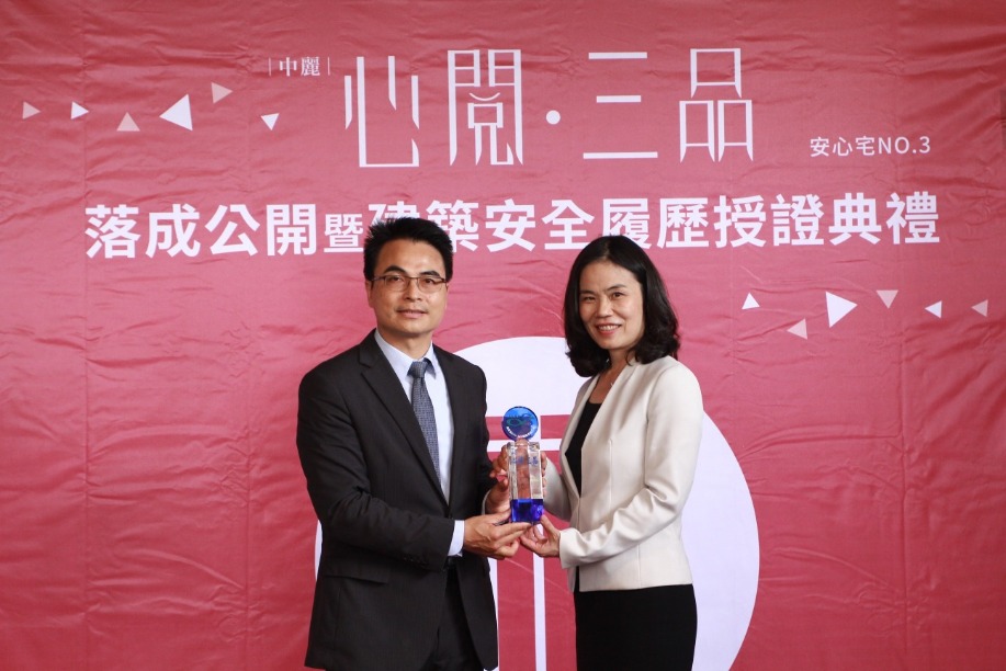 (如今「中麗建設 – 心閱.三品」正式完工落成,特予頒發「建築安全履歷認證標章」,
