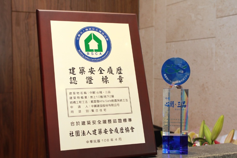 歷經幾次強烈地震的侵襲,檢討過去放眼未來,「建築安全履歷協會」戴雲發理事長長期以來推動「建築安全履歷」,希望達成施工品質透明化。如今「中麗建設 – 心閱.三品」正式完工落成,於4月22日(日)特予頒發「建築安全履歷認證標章」,也象徵著台灣的建築安全履歷好建築又增加了一件。