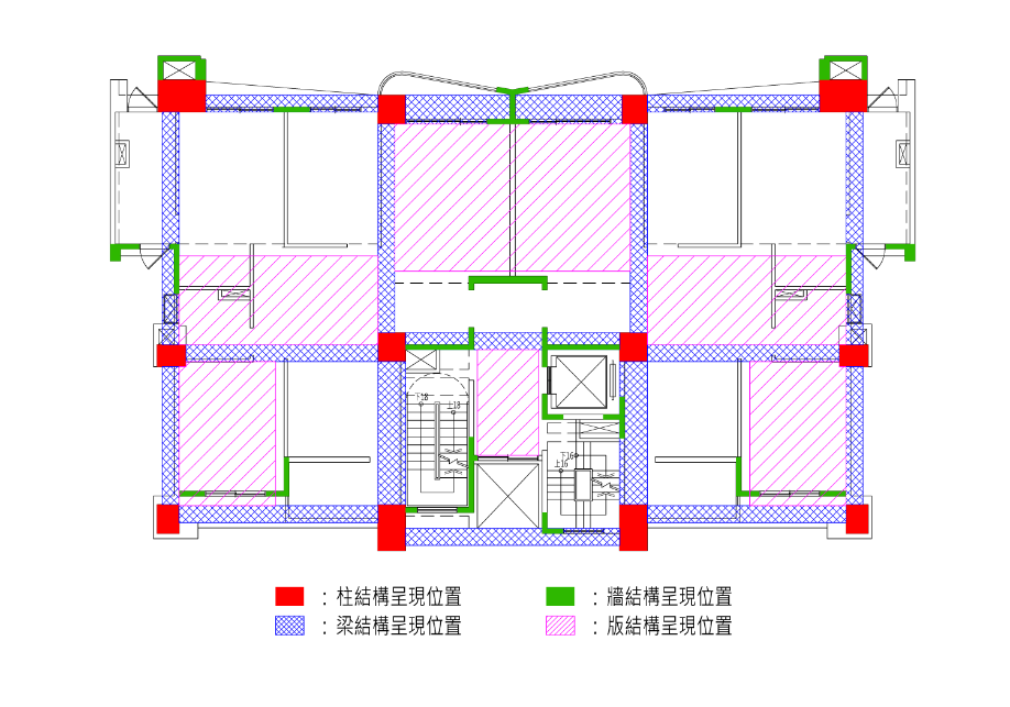 建築安全履歷協會針對建築安全履歷之施工品質細節拍照,查驗項目完整紀錄呈現及該協會所制定的結構安全重點將舉辦教育訓練,並協助輔導工地進行各戶結構重點呈現之位置檢討,其包括柱、牆、梁、版等相關之平面圖位置標記,讓查驗技師或工程師在後續鋼筋工程進行中,依平面圖標記之結構重點位置查核、改善修正並完成履歷拍照紀錄。 (完整呈現之履歷平面圖示意)